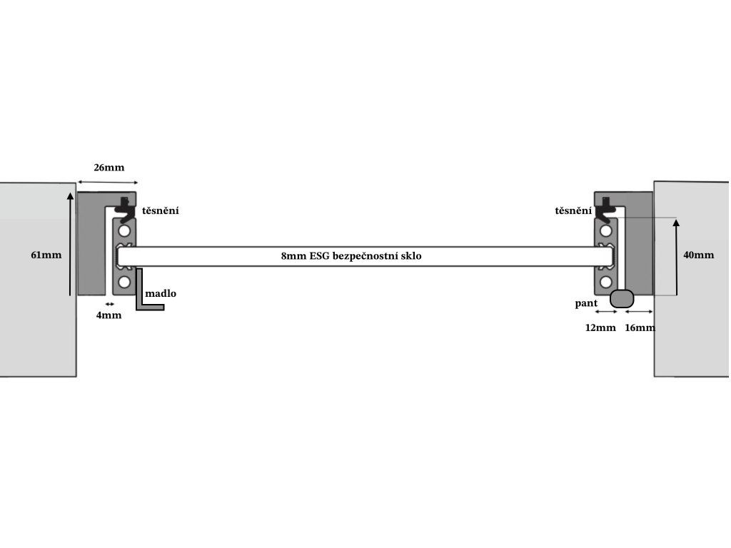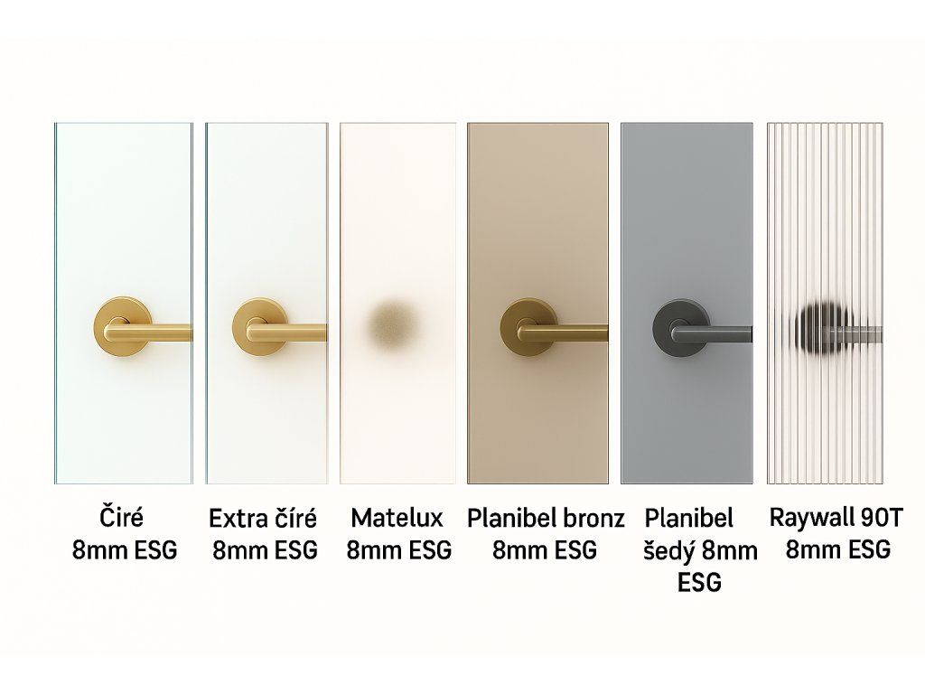 - Výplň: bezpečnostní sklo ESG tloušťky 8mm (čiré / mléčné / kouřové / bronzové, dekorativní – dle konfigurace)